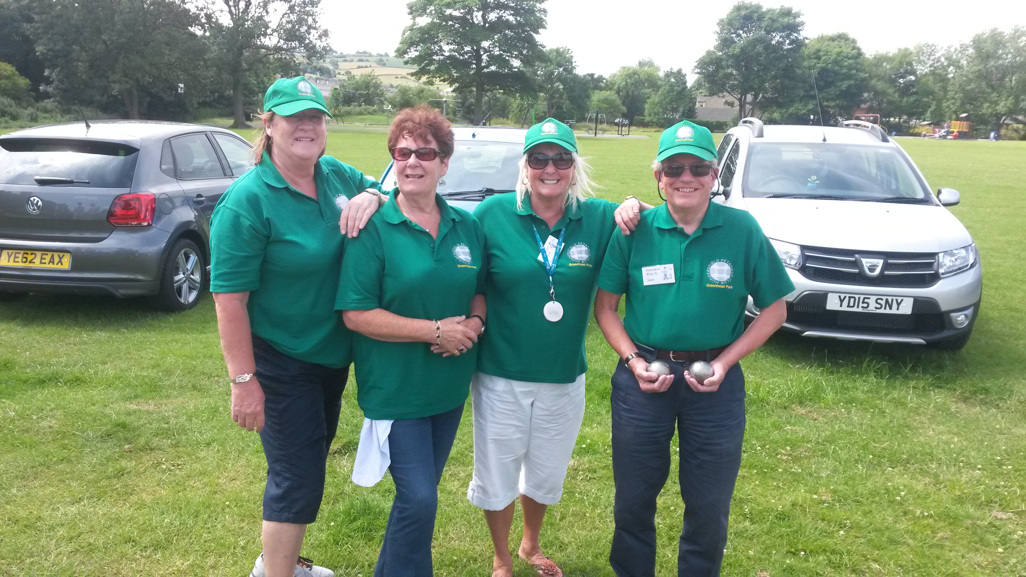 For the second time in a week Huddersfield win a pot. At the Mirfield pairs event Roy and Sue won 2 out of three games as did Pat and Julie but Pat & Julie had the better points difference and won a cash prize for their 3rd place. Lots of distractions – a cricket match, a beer festival, an antique american school bus serving burgers and a lorra lorra people and cars milling about but another great result. Pat and Julie called their team the Munchkins…