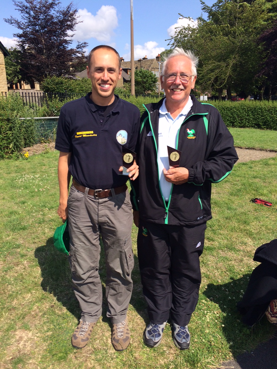 19 people turned up for the club pairs event which made the maths difficult but after 3 rounds Rock & Roll (Robin & Rita) had won 3 games with +29 and Bouleangers (Daniel and David) had won 3 games with +32. The Bar Stewards (Doug and Alan) had also won 3 but with a small points difference so we were looking to a thrilling final with two free scoring teams. With plenty of spectators (aka hecklers) it turned out to be short affair and Daniel and David won the title of Club Pairs champions for 2015 and received a stylish trophy each.