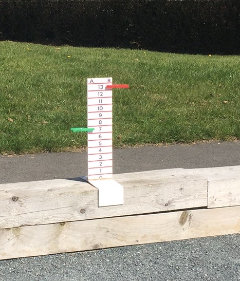Our first attempts were basically a ruler fixed on top of a 2 b’ 3 wooden block and a nail. A hole was made in the sleeper and the nail located in that hole and the scorer stood at a jaunty angle and showed off its home made numbers drawn in felt tip pen by someone. A peg was used to clip opposite the number and it sort of worked. When both teams had the same number of points one of the pegs fell off. It stayed leaning in its hole somewhere near where the game was being played.