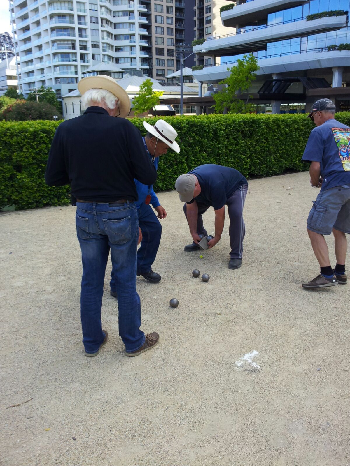 The first in a never ending series of photos of members playing petanque in foreign places. Robin popped over to Australia and found a tournament to enter in Sydney and reached the fnal. Here’s some proof. Only the English wear shorts in Spring.