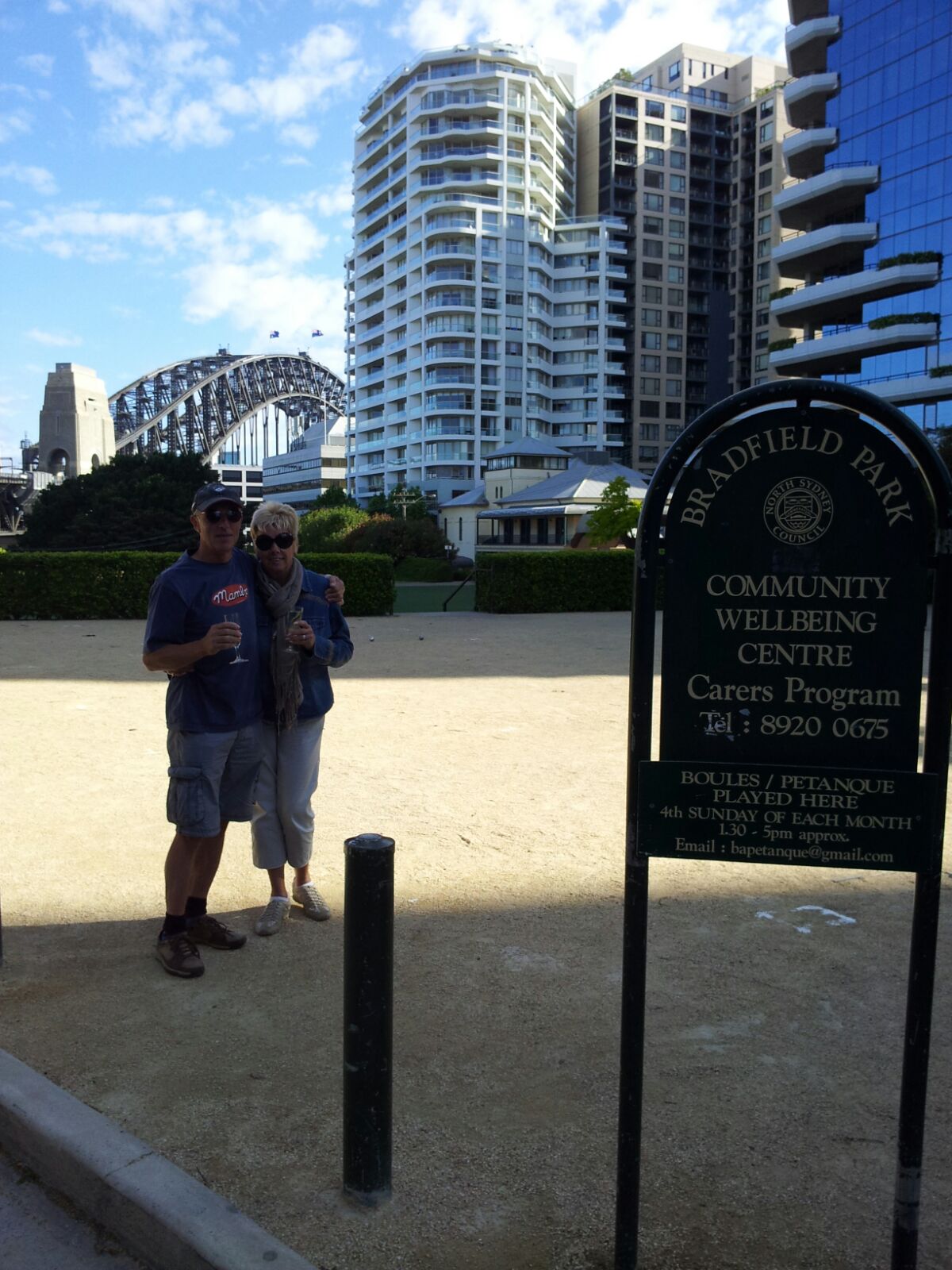 And here’s Robin and Rita posing with a boule in their hand in front of the Sydney Harbour Bridge. No wait! It’s a glass of some liquid or other…
