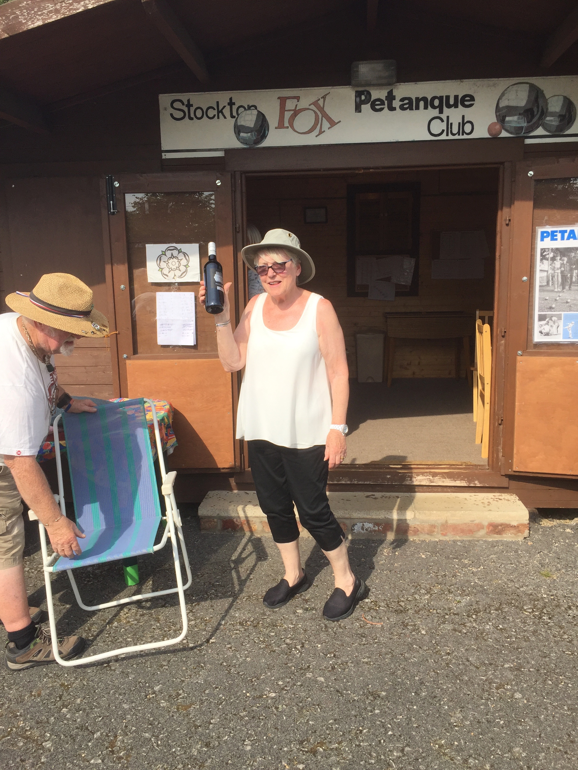 Here she is showing off her bottle of wine for 3rd place alongside a man folding up a chair. Other successes were in the raffle where 6 prizes were won by Huddersfield members including a Swiss roll, a bag of sweets and 2 bottles of wine.