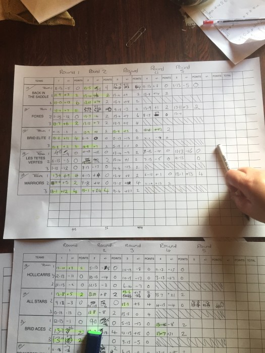 The format was 3 pairs followed by 2 triples. Wins were assigned different points. A win where opposition scored 6 or more was 2 points, a good win (opposition scored under 6) was 4 points and a thrashing (opposition on zero) was 6 points.