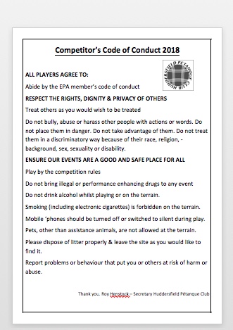 The English Petanque Association has a code of conduct for competitions and we at Huddersfield are happy to adopt it for competitions we run here. It’s mostly common sense but it does specify particular things you should or must not do, See it by clicking here.