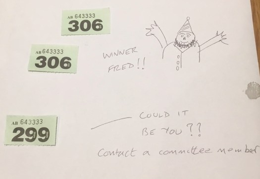 The Christmas elves have drawn a picture of the winners with their tickets. (They’re not much good at drawing so excuse the quality). There was also a ticket drawn that belongs to someone out there. Both tickets are on green and we need the owner of ticket 299 to get in touch. There’s a basket of Xmas goodies waiting for you.
