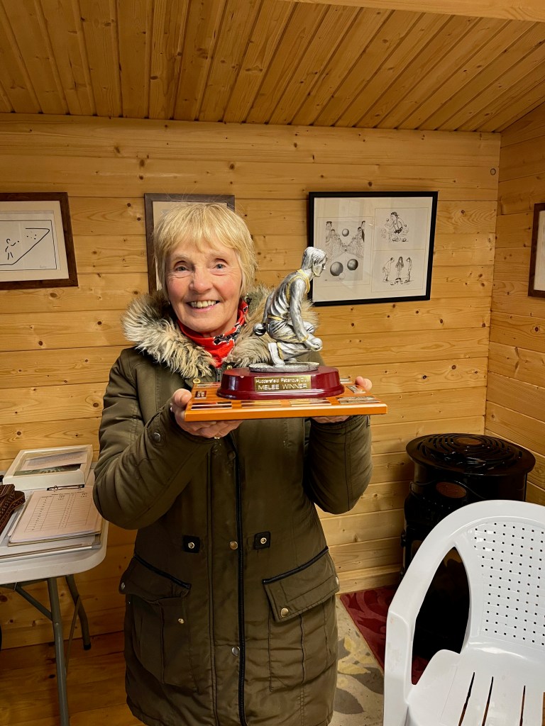 An amazing number of people on the terrain for the final melee of 2021. Although only three players could win it wasn’t decided until they last game of the day. Maureen couldn’t improve on her 33 points, Sue improved by 3 to reach 29 but Christine improved by 11 to jump to 37 and top the table.