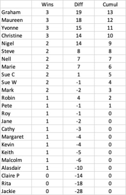 Maureen again did very well – it seems to be Maureen’s speciality, but was pipped for top place by Graham. Also with 3 wins were Yvonne and Christine. Next one is April 3rd.