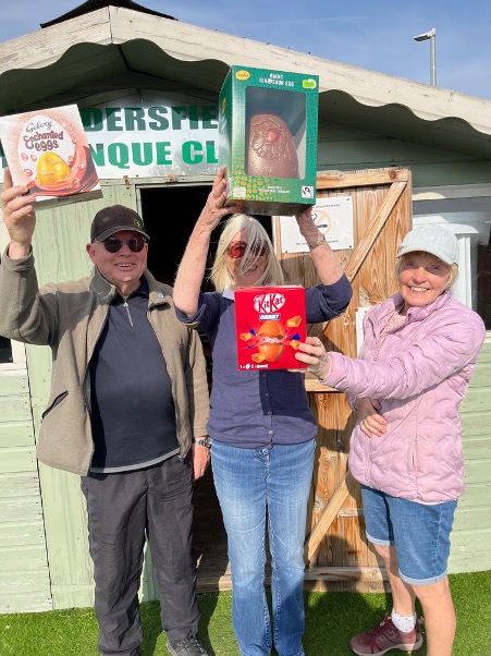Easter egg melee went well. Everyone won an egg but some eggs were bigger than others. The three main prizes went to Christine in 3rd place but Kevin and Margaret had identical records of 3 wins and +17 points so Kevin gallantly let Margaret take the dinosaur egg while he took the second prize.