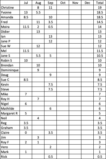 Ian was the winner with 3 wins; Jane and Christine were 2nd and 3rd also with 3 wins but worse points difference. Welcome to new players Rick, Mike and Mathilde. Cumulative totals below. There are another 11 people who have played but not troubled the scorers. 44 players in total have played at least one event. E&OE. This table compiled from a whatsapp image rather than the actual scoresheet.