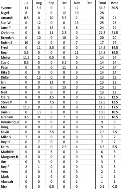 The final positions were 1st Sue Weston, 2nd Yvonne & 3rd Reg. Cumulative scores below