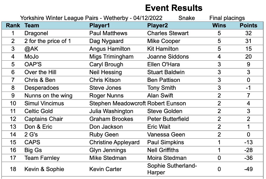 Sunday 4th December. Cold and wet and sunset at 3-46pm but 18 teams ate bacon sandwiches for breakfast, played all day in light showers and arctic winds and enjoyed themselves immensely for just a fiver each but unfortunately HPC teams didn’t get anywhere near the top places. Readers may not know some of the names who did make the top 3 places but they are all county level players for Yorkshire and Dag is the regional coach.