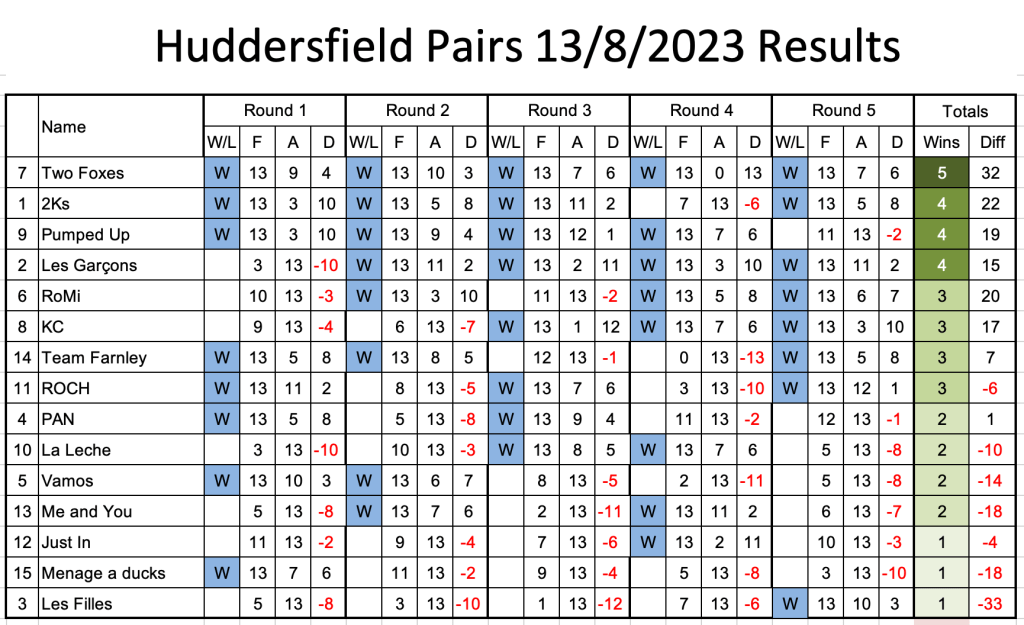 HPC’s open pairs tournament survived very wetting showers interspersed with blazing sunshine. 15 pairs competed, with the hosts having members in the prize money in positions 2, 3, and 4. The winners – Two Foxes from Stockton Fox – won all five matches with a creditable 32 points. Well done Ralph and Robert. Thanks to all HPC members who helped to make the day run so smoothly. Click to enlarge image below.