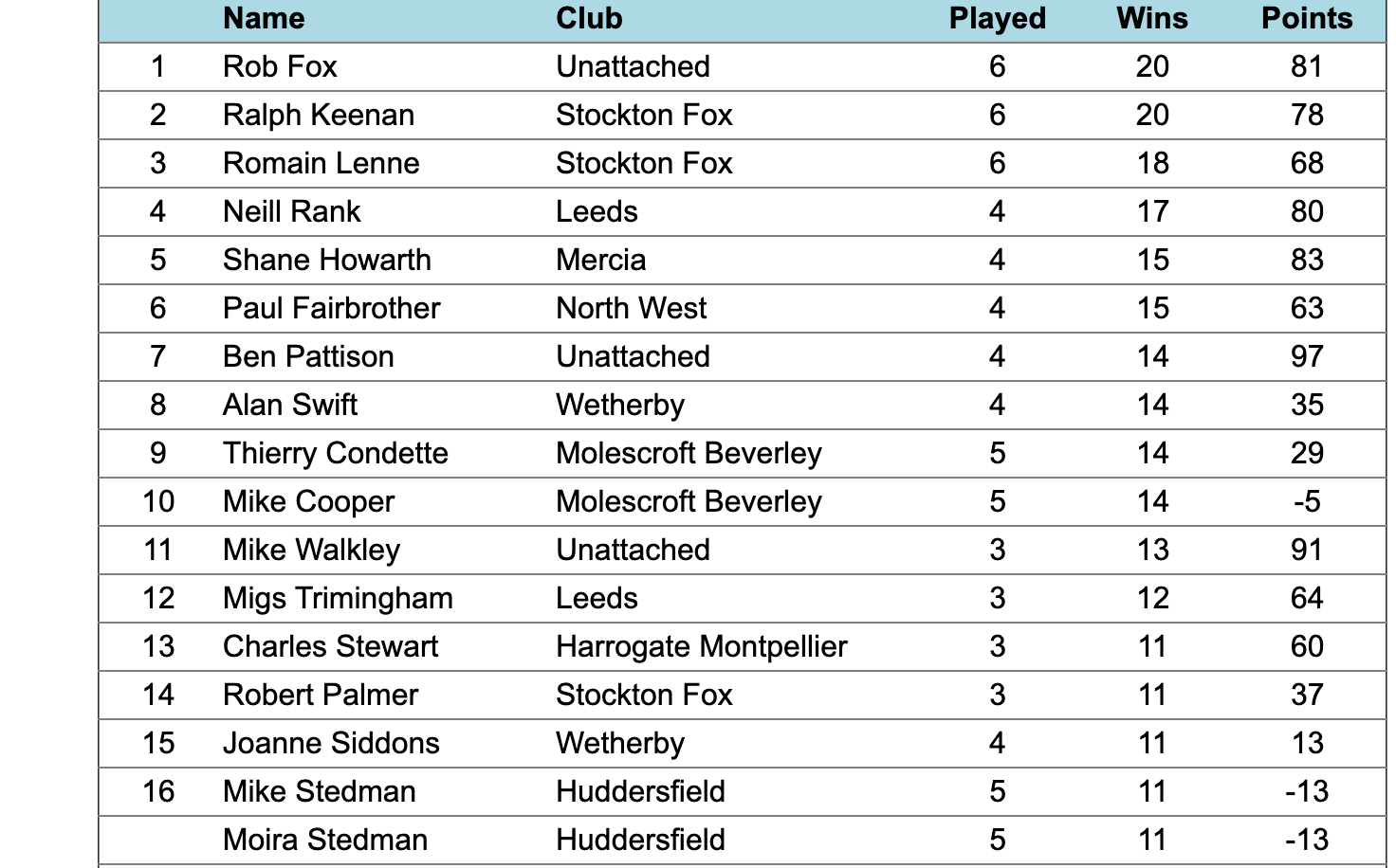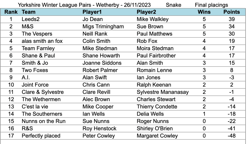 The result from Sunday’s Winter Pairs at Wetherby is a terrific 5th place out of 17 teams for Moira & Mike. Above them are a few regional and national level players but below them are plenty of regional and national level players. Well done! The league table also shows them highly placed. There are over 100 players who have taken part this season and they are the leading HPC members in 16th place in the table.