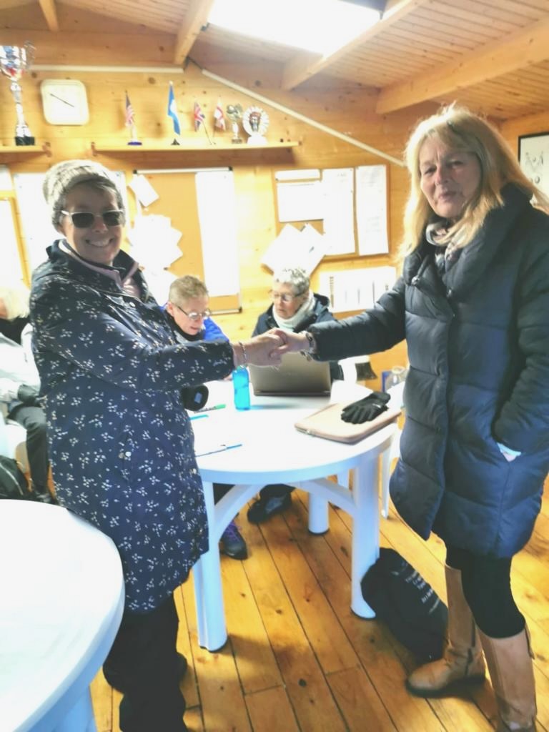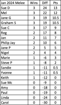 Sue D was the winner with 3 wins and +24, Mel, Jane G, Graham S and Sue C all won 3 games with lower points difference. Cumulative table same as January table. Things will change on February 4th. Scorers Amanda and Barbara in the background.
