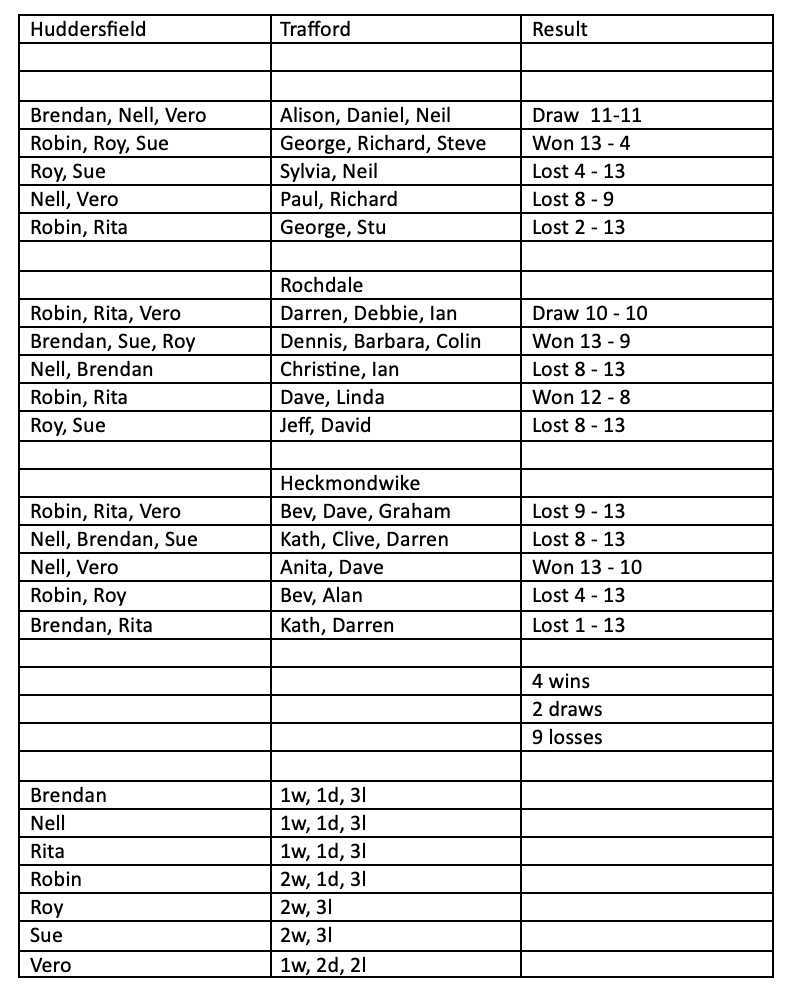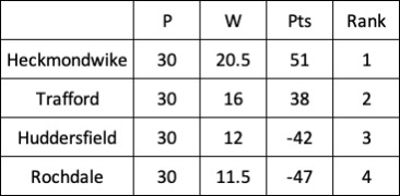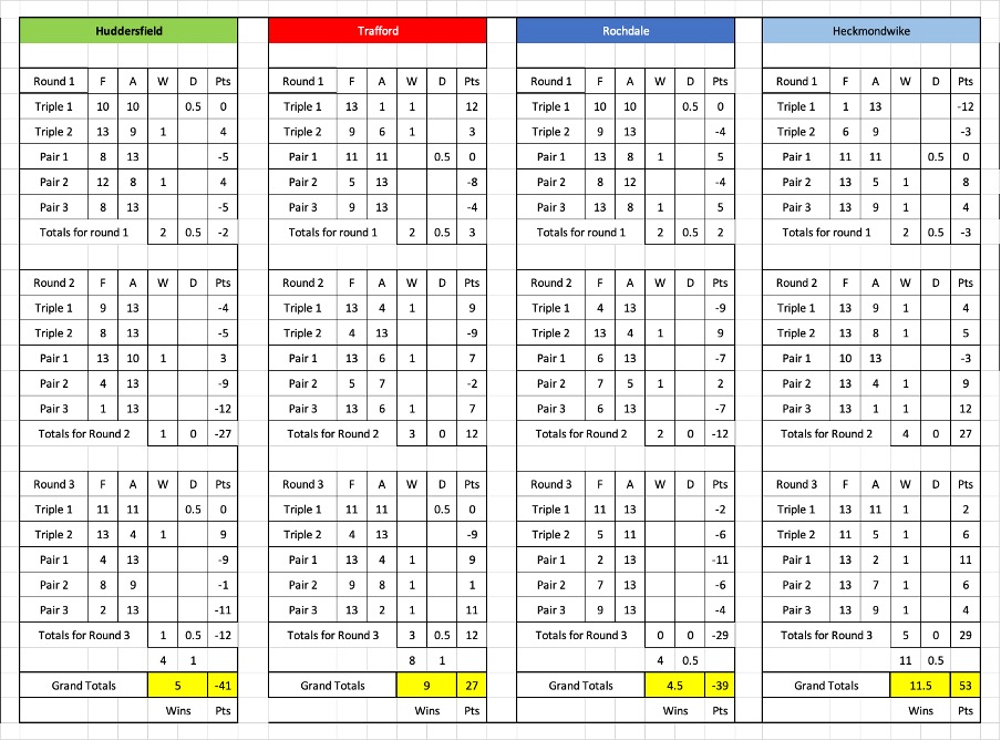 Sunday 28th January saw the second round of the Pennine league at Trafford. Team of the day was Heckmondwike winning eleven and a half of their 15 games. Updated table below.