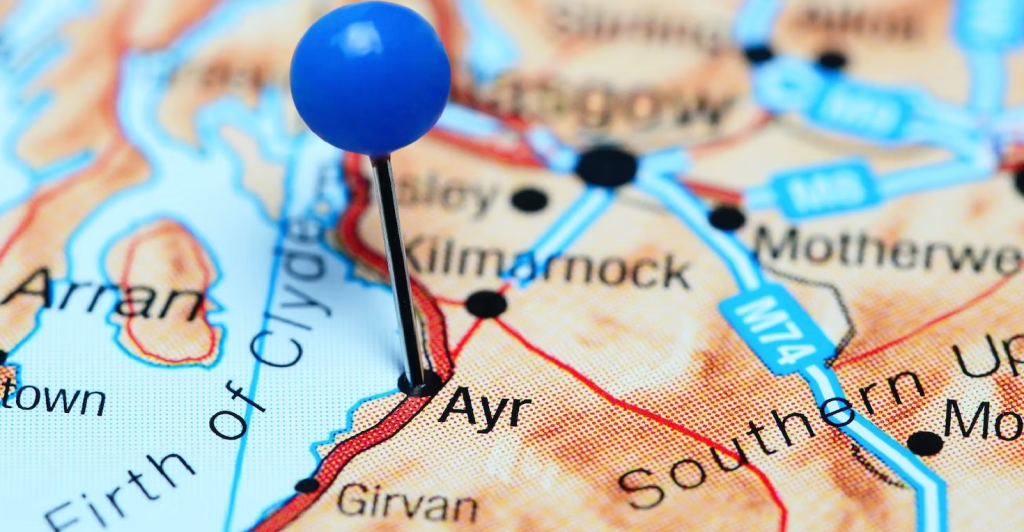 Ayr is a coastal town which lies on the mouth of the River Ayr which flows out into the Firth of Clyde. The Isle of Arran is nearby and, on a very clear day, you can see the northern tip of Northern Ireland. To get there bear left at Gretna Green.