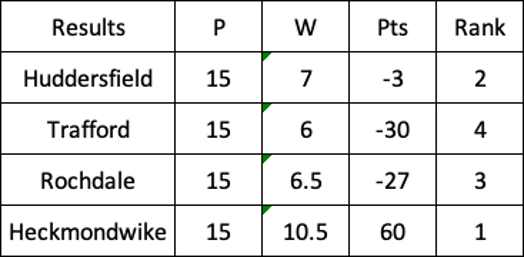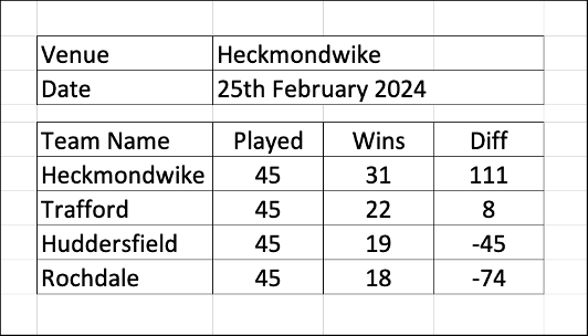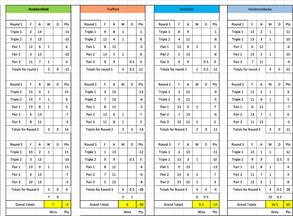 Posted on February 27, 2024February 27, 2024 by huddersfieldpetanquePennine League Sunday 25th February was at Heckmondwike. Click to enlarge. E &OE. Result on the day Cumulative table HPC winners: Brendan 5, Nell 5, Rita 2, Robin 2, Sue 2, Roy 1