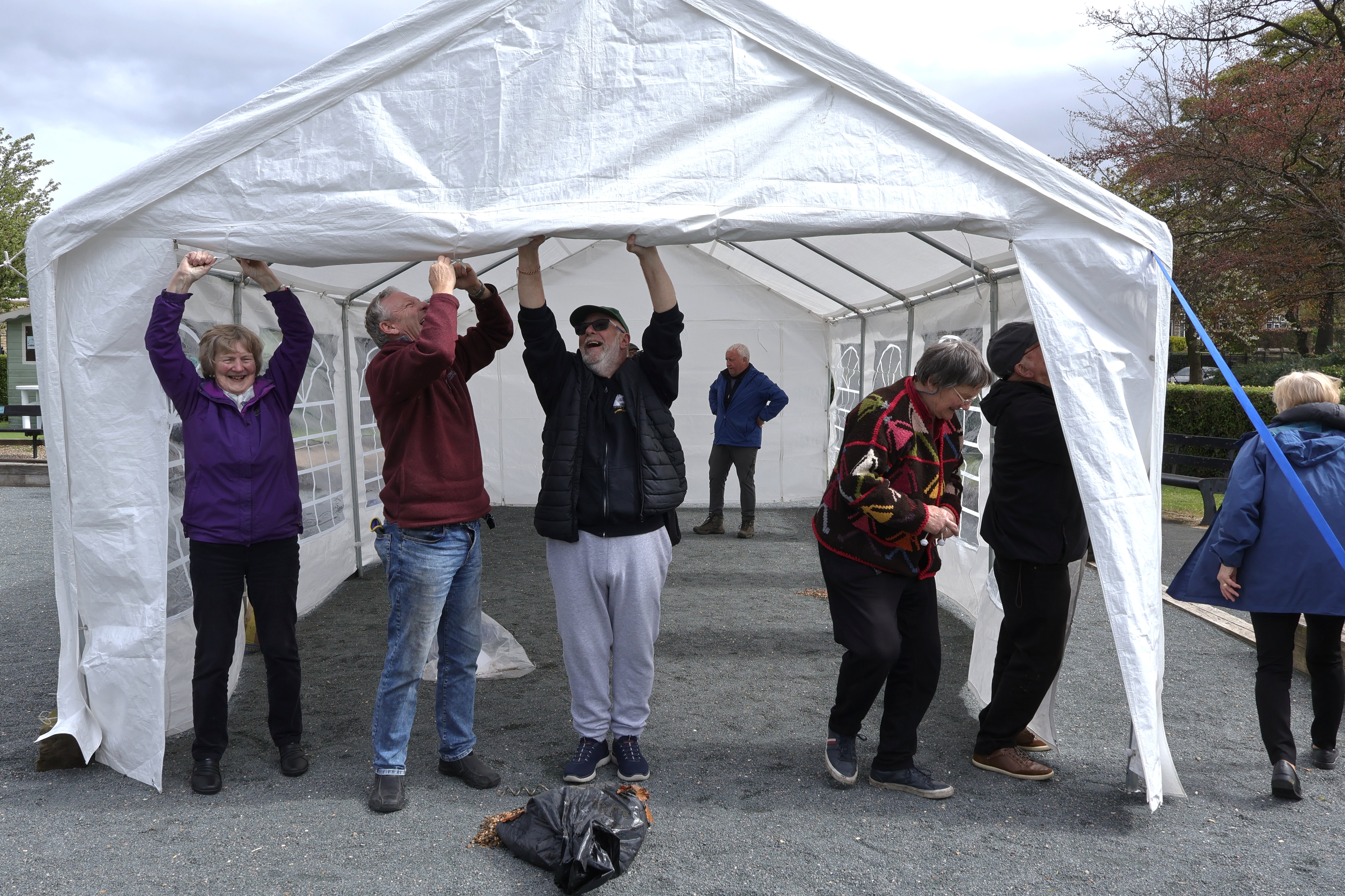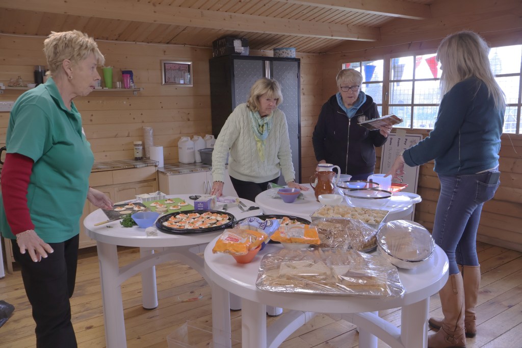 The erection squad made sure the marquee went up, despite having to hold it down during the strong gusts of wind. Meanwhile the food team had prepared a feast and set aside 15 bottles of Prosecco