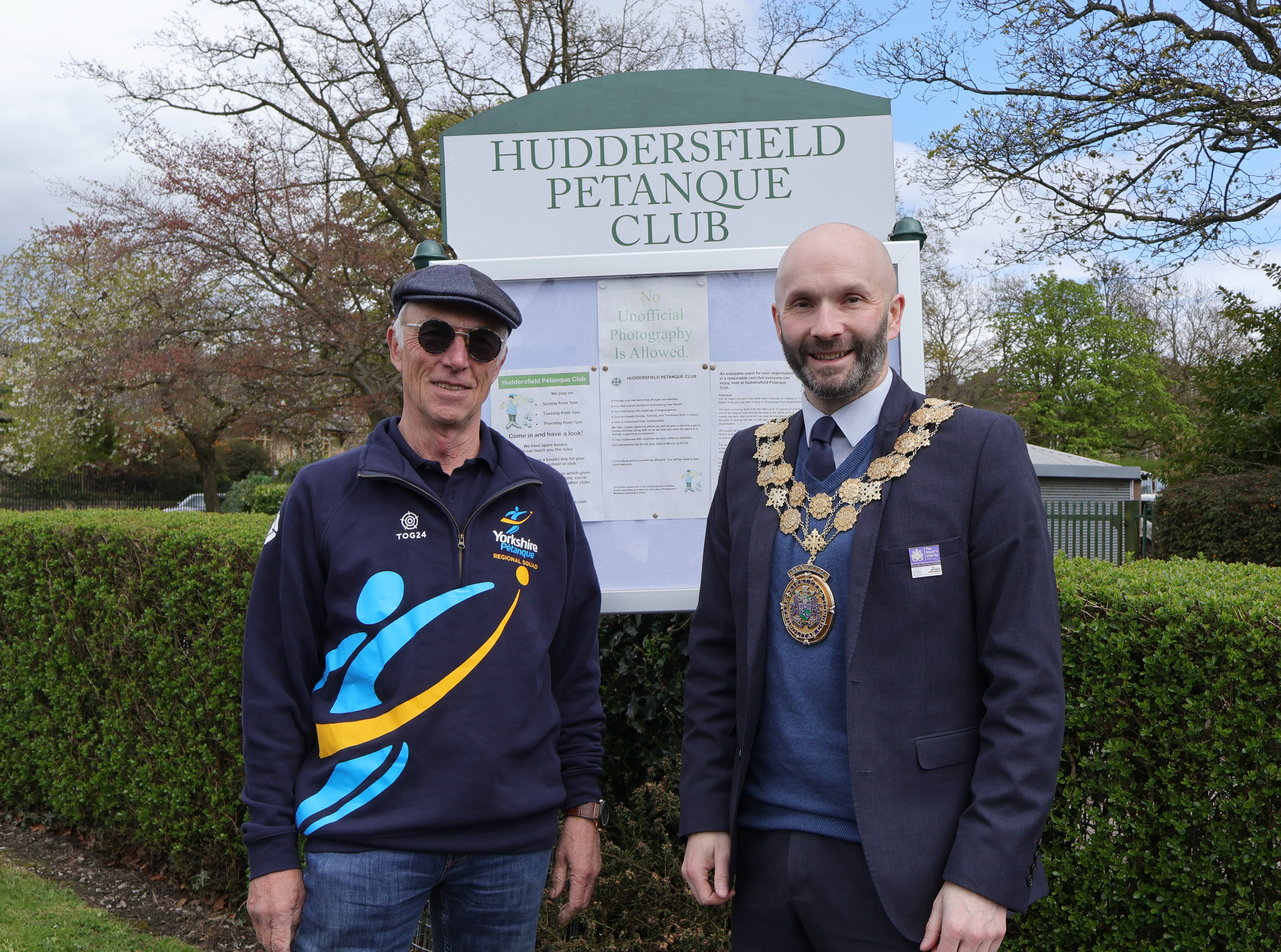 Robin, wearing his Yorkshire kit, welcomed the Mayor, Cahal Burke, and showed him around the clubhouse and the terrain.