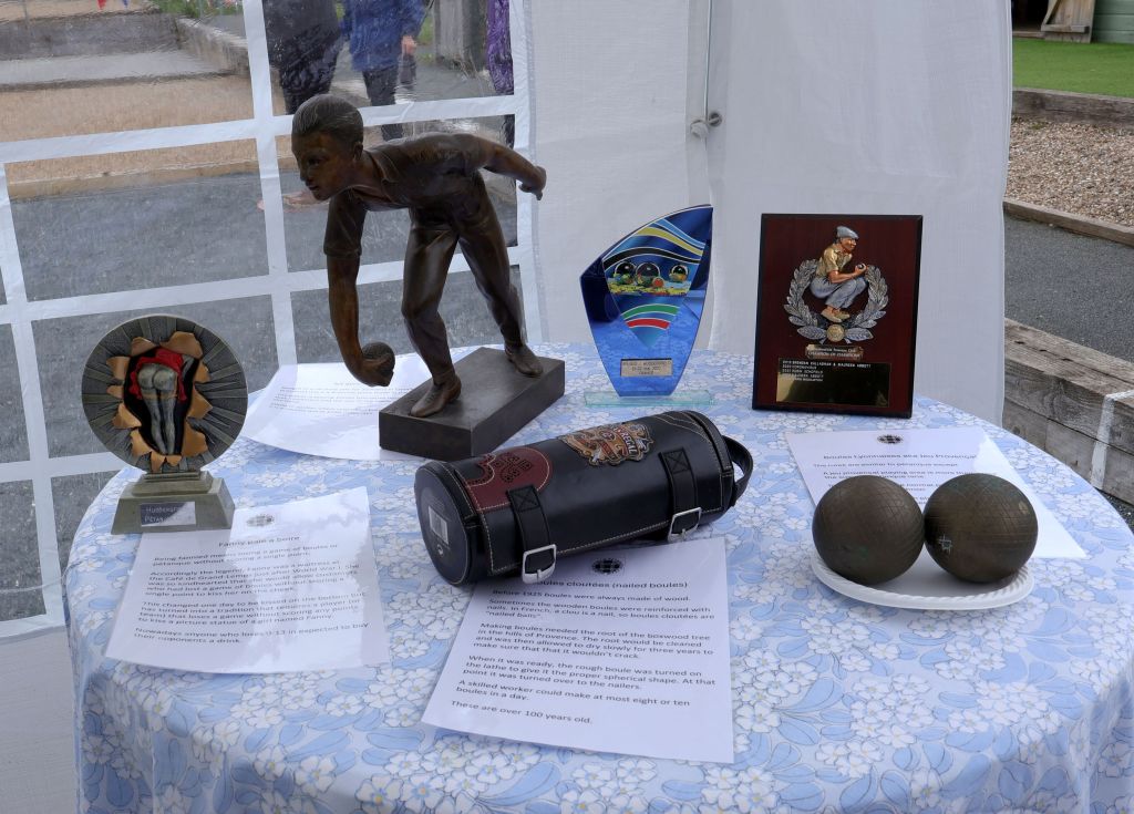 Some historic and traditional pétanque memorabilia were on display. Boules lyonnaises, boules cloutées, a fanny trophy, the Trip to Bordeaux trophy, The club champion of champions trophy and an art deco spelter statue showing a jeu provençal player.