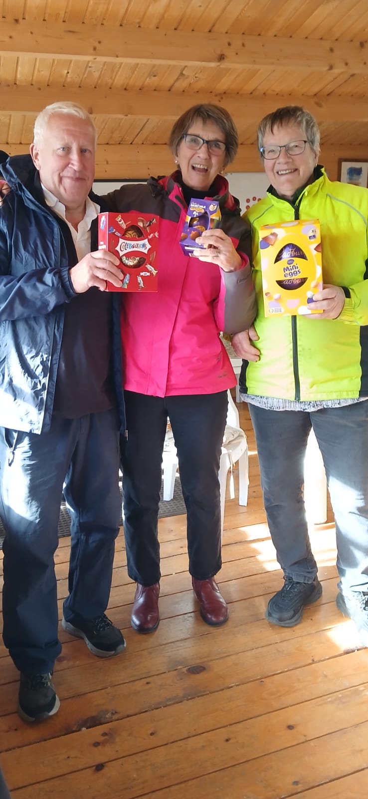 Easter games on Easter Sunday led to a shared first place with Doug and Nell both winning 3 games and 21 points difference. Jan came 3rd with 3 wins and 19 points. A good afternoon enjoyed by 24 members in sunshine, rain and hail. Next monthly melee 3rd May.