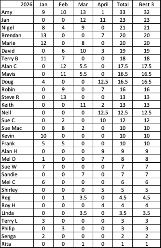 So with three rounds done and Trafford’s game being pushed back till June, our representative players have scored wins as follows:-