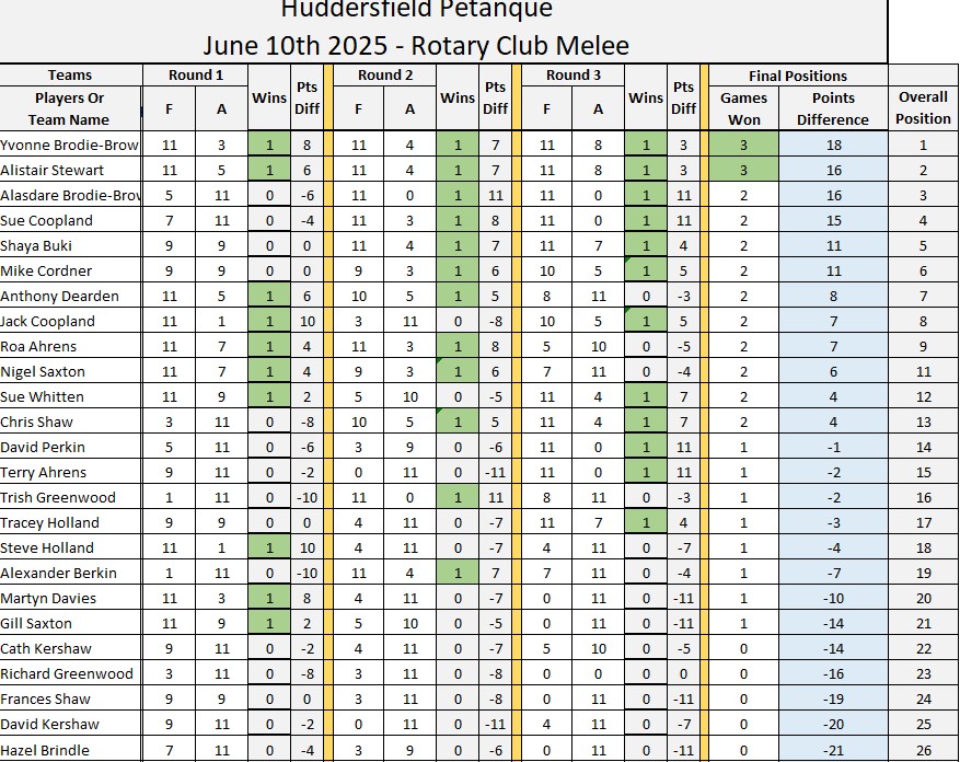 The Huddersfield Rotary Club booked an evening of Petanque entertainment on June 10th. 25 players took part in the 3 round Melee competition.