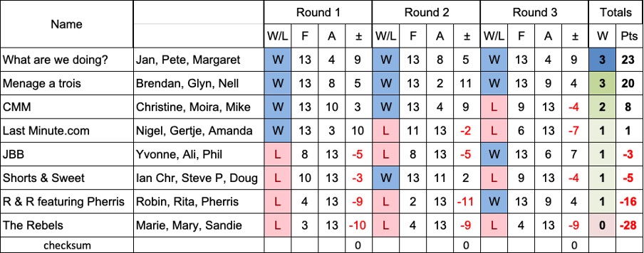 A close fought contest between determined players resulted in no-one winning all 3 games but with 2 wins +8 Chantel was declared the winner with Moira a close second with 2 wins +5.