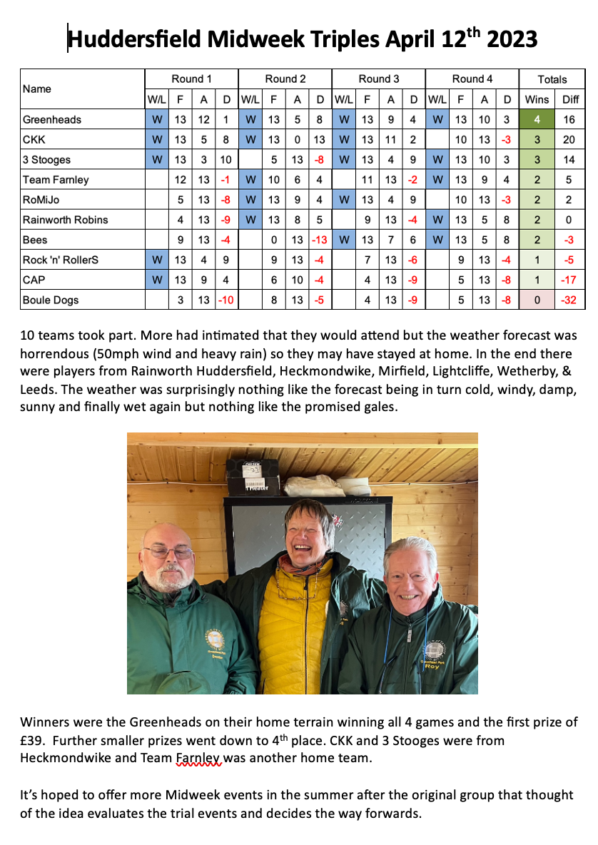 Mayday Melee on Monday May 1st – Trafford Pétanque will host a 4 round melée at the boulodrome in Victoria Park, Stretford. The event will start with its 1st round game at 1pm. Games will be timed to 50 mins plus 1 end. Entry fee is £5 and there will be prizes for the top 3 to 6 players depending on total number of players entered.