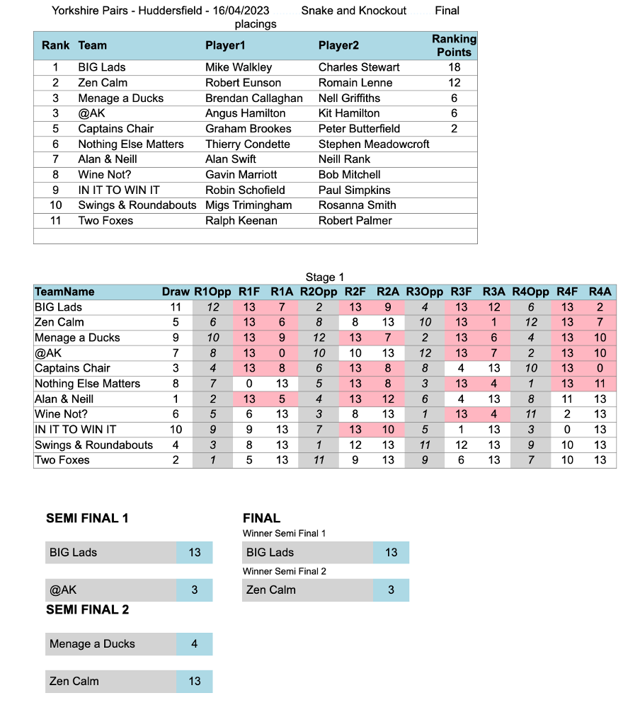 Sunday was the region’s Pairs competition. The winners will go forward to represent Yorkshire as our Pairs champions to a national event later in the year. It was a long day with a 4 round snake to rank the teams and the top 4 going on to semi finals and a final making 6 games for the finalists. Brendan and Nell were the 3rd place team which is a tremendous result for the club. Here’s the complex results sheet.