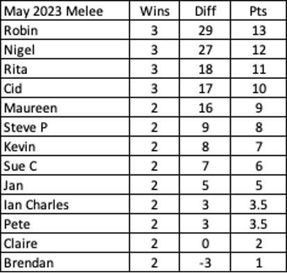 26 people turned up and Robin was the winner. Next month on the 4th of June will see the climax of the Spring season. 8 players can win the title but 3 men are in pole position. 11 players don’t feature in the cumulative table as they haven’t scored a point yet. All will be sorted out next month. Let’s hope for sun.