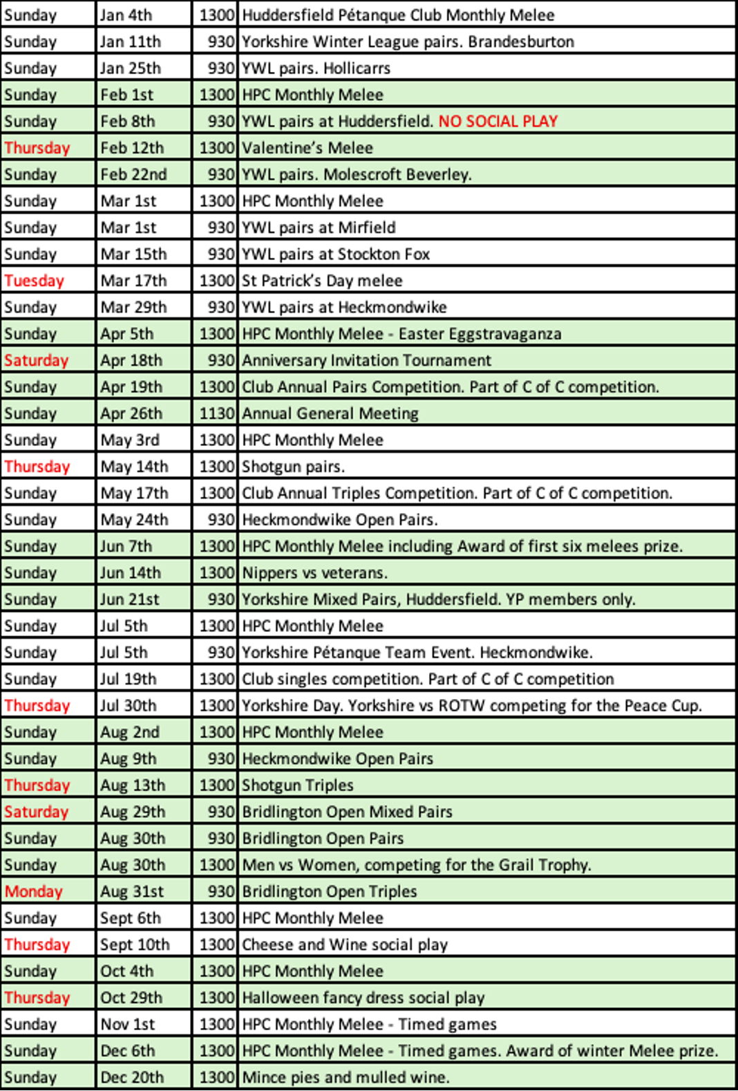 Version 3 (280126) All HPC events are free to members. Yorkshire Winter League is £10 per pair entry fee. Social play every Tuesday, Thursday and Sunday from 1pm for a few hours. Visitors from other clubs welcome.