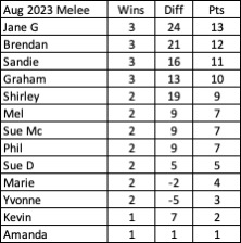 Monday’s Triples only had 14 entries. Brendan & Nell teamed up with a player from another club and won 2 games but only placed 13th. This shows is that HPC teams can compete at regional level.