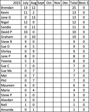 22 Mixed Pairs on Sunday and Robin & Rita took 7th place with 3 wins. Didier & Dominique a marqué 2 victoires pour 12eme. Pete & Margaret 14th. Brendan & Nell 16th place. Team Farnley made 19th.