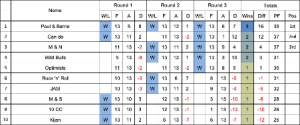 A different type of members melee. There were 22 people at the terrain, some not playing, some playing in singles league games or 123 team games and some in a melee. There were 2 visitors from Bordeaux on holiday in Huddersfield who just happened to have brought their boules with them. Some were late; some dropped out but after everything was taken into consideration the winner was Richard followed by 4 ladies.