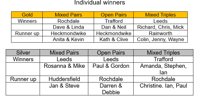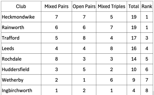 Rainworth and Heckmondwike play one end triples tie-break for first place. 3rd place initially awarded to Rochdale goes to Trafford following stewards enquiry.