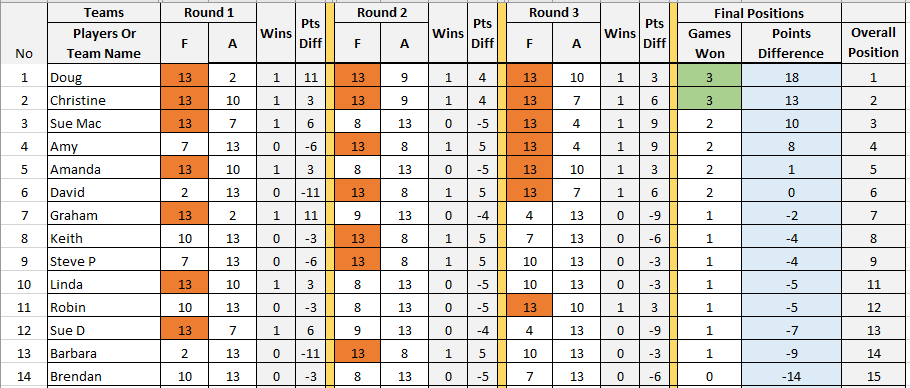 Winners were Team “LFSU”’s Lori/ & Sabrina Seville with 5 wins +36 points with second A&K Anita/ Kath 5 wins +8 points.