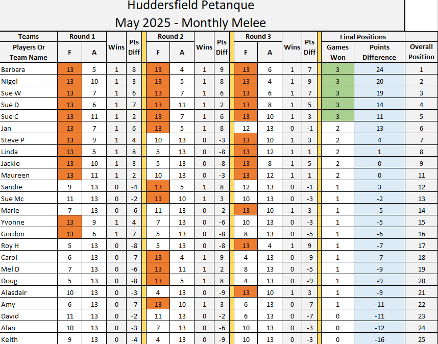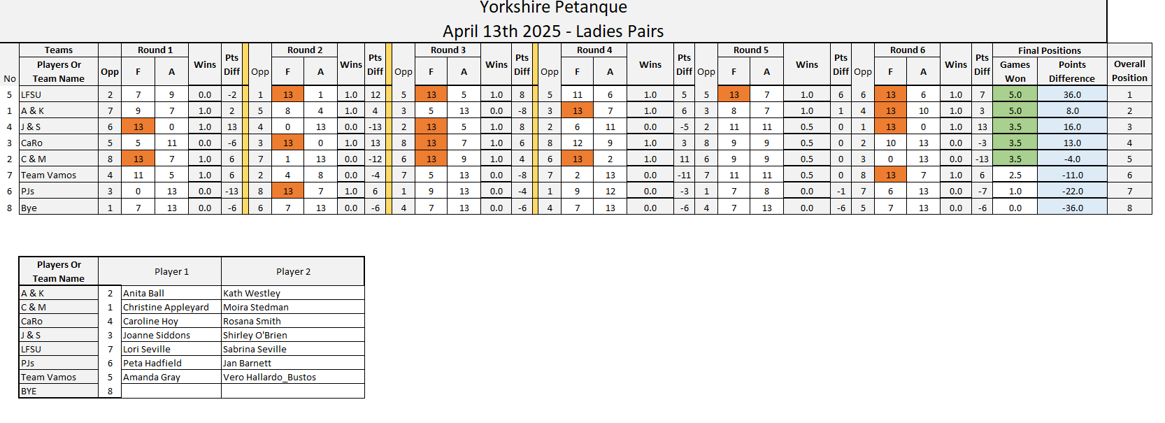 Seven Teams in total competed for the YorkShire Petanque Ladies Doubles Competition at Huddersfield on April 13th. The lovely weather held out to finish the weekend off nicely. Each team played 5 games with 1 bye.